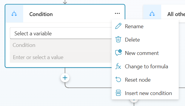 - Add a condition node and click 3 dots and switch to formula by selecting “Change to formula”. This step checks whether there’s a matching identifier of our interest in the user prompt.